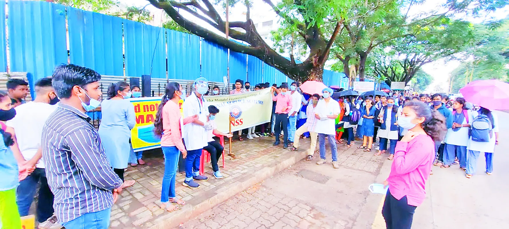 कॉलेजच्या राष्ट्रीय सेवा योजनेअंतर्गत विद्यार्थ्यांनी ऑक्सिजन सिलिंडरसह पथनाटय़ सादर केले. ऑक्सिजन नसल्याने रुग्णाला कसा त्रास होतो? याचे सादरीकरण त्यांनी केले व ज्या लोकांनी मास्क परिधान केला नव्हता त्यांना चॉकलेटसह मास्क देऊन विनंती करण्यात आली. राणी चन्नम्मा सर्कल ते उद्यमबागपर्यंत विद्यार्थ्यांनी पथनाटय़ सादर केले. त्यांना प्रा. बाळाप्पा, प्रा. अनंत घाडी यांचे सहकार्य लाभले.