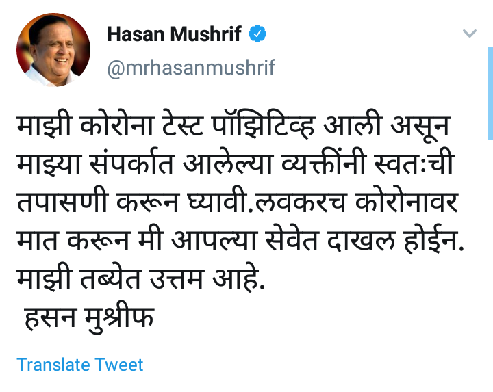 ठाकरे सरकारमधील आणखी एका मंत्र्याला कोरोनाची बाधा झाली आहे. काँग्रेस नेते हसन मुश्रीफ यांचे कोरोना रिपोर्ट पॉझिटिव्ह आले आहेत. त्यांनी स्वतः ट्विट करत याबाबत माहिती दिली.