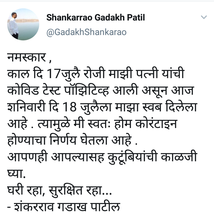 याबाबत अधिक माहिती देताना शंकरराव पाटील आपल्या ट्विटमध्ये म्हणाले की, नमस्कार , काल 17 जुलै रोजी माझी पत्नी यांची कोविड टेस्ट पॉझिटिव्ह आली असून आज शनिवारी 18 जुलैला माझा स्वब दिलेला आहे. त्यामुळे मी स्वतः होम क्वारंटाइन होण्याचा निर्णय घेतला आहे . आपणही आपल्यासह कुटूंबियांची काळजी घ्या. घरी रहा, सुरक्षित रहा… असेही त्यांनी सांगितले आहे.