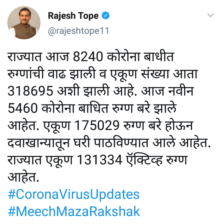 सध्या राज्यात 1 लाख 31 हजार 334 रुग्णांवर विविध रुग्णालयात उपचार सुरू आहेत. तर मृतांचा एकूण आकडा 12 हजार 030 वर पोहोचला आहे. सध्या राज्यात रुग्ण बरे होण्याचे प्रमाण 54.92 टक्के असून मृत्यूचे प्रमाण 3.77 टक्के इतके आहे.