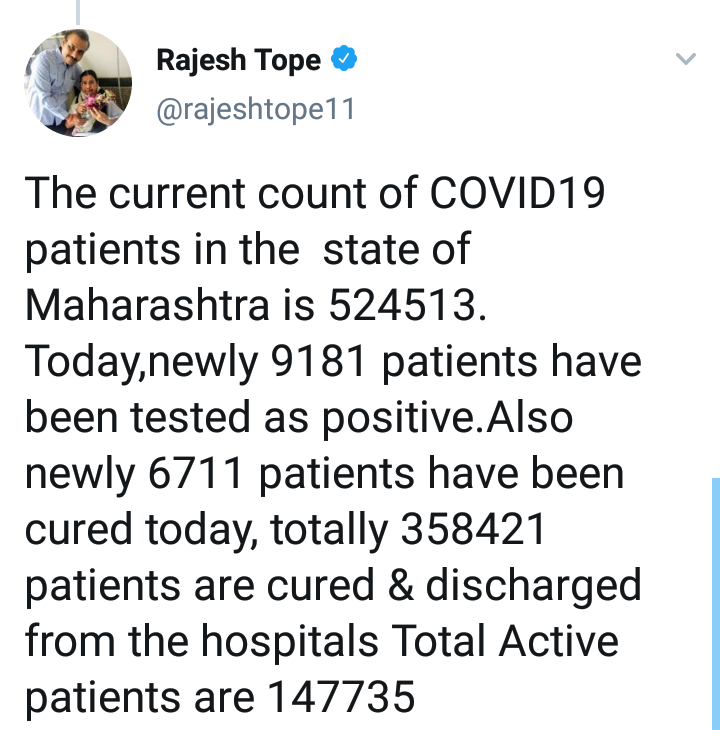 पुढे ते म्हणाले, त्यातच दिलासादायक बाब म्हणजे सोमवारी एका दिवसात 6,711 जणांनी कोरोनावर यशस्वी मात केली. त्यामुळे आतापर्यंत 3 लाख 58 हजार 421 रुग्ण कोरोनामुक्त झाले आहेत. तर सध्या राज्यात रुग्ण बरे होण्याचे प्रमाण 68.33 टक्के इतके आहे.