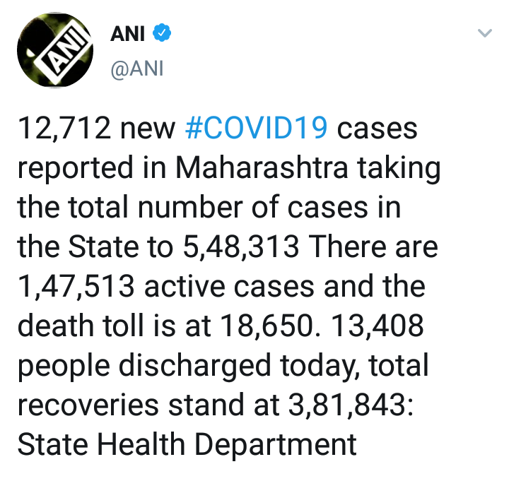 दरम्यान, मागील 24 तासात राज्यात 12,714 नवे कोरोनाबाधित रुग्ण आढळले. त्यामुळे राज्यातील एकूण कोरोनाबाधितांची संख्या 5 लाख 48 हजार 313 वर पोहचली आहे. सध्या 1 लाख 47 हजार 513 रुग्ण उपचार घेत आहेत. बुधवारी दिवसभरात 344 कोरोनाबाधितांचा मृत्यू झाला. तर मृतांचा एकूण आकडा 18 हजार 650 एवढा आहे. सध्या राज्यातील मृत्यू दर 3.4 % आहे.