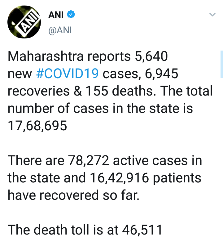 दरम्यान, मागील 24 तासात राज्यात 5, 640 नवे कोरोनाबाधित रुग्ण आढळले. त्यामुळे राज्यातील एकूण कोरोनाबाधितांची संख्या 17 लाख 68 हजार 695 वर पोहचली आहे. सध्या 78 हजार 272 रुग्ण उपचार घेत आहेत. काल दिवसभरात 155 कोरोनाबाधितांचा मृत्यू झाला. तर मृतांचा एकूण आकडा 46 हजार 511 एवढा आहे. सध्या राज्यातील मृत्यू दर 2.63 % आहे.