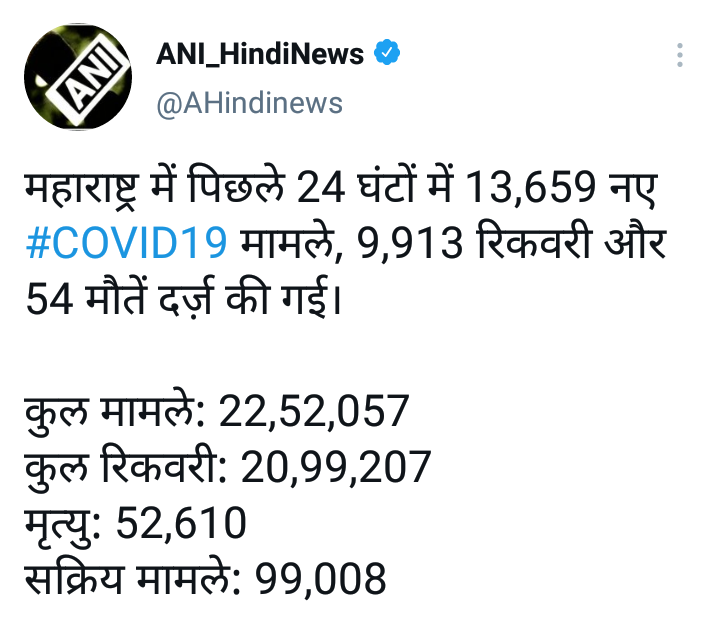 महाराष्ट्रात दिवसेंदिवस कोरोना रुग्णांची संख्या झपाट्याने वाढत आहे. मागील 24 तासात 13,659 नवीन कोरोनाबाधित रुग्णांची नोंद झाली असून 54 जणांचा मृत्यू झाला आहे. त्यामुळे राज्यातील एकूण कोरोना बाधितांची संख्या 22 लाख 52 हजार 057 वर पोहचली आहे. तर मृतांचा एकूण आकडा 52 हजार 610 एवढा आहे.