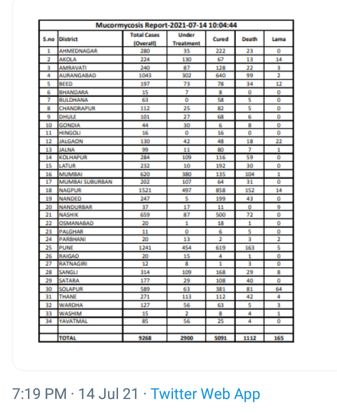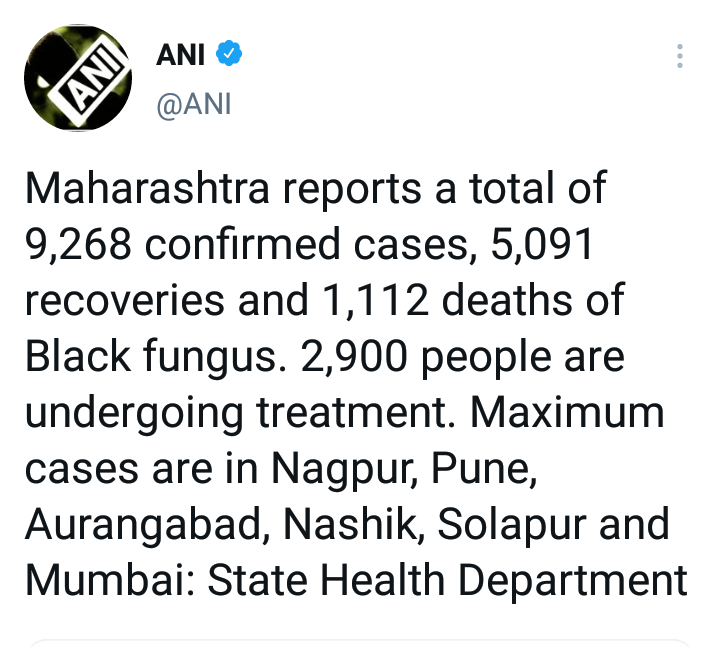 ताज्या आकडेवारीनुसार महाराष्ट्रात आतापर्यंत ‘ब्लॅक फंगस’ चे 9 हजार 268 रुग्ण आढळून आले आहेत. त्यामधील 1,112 जणांचा मृत्यू झाला आहे. तर सध्या 2,900 रूग्णांवर उपचार सुरू आहेत. राज्याच्या आरोग्य विभागाने यासंदर्भात माहिती दिली आहे.