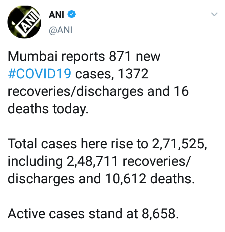 मुंबईत काल दिवसभरात 871 नव्या कोरोना रुग्णांची नोंद झाली. तर 16 जणांचा मृत्यू झाला. त्यामुळे मुंबईतील कोरोना रुग्णांची एकूण संख्या 2,71,525 इतकी झाली आहे. काल दिवसभरात 1372 रुग्णांना घरी सोडण्यात आले. तर आतापर्यंत 02 लाख 48 हजार 711 रुग्ण कोरोनामुक्त झाले असून, त्यांना डिस्चार्ज देण्यात आला आहे. सध्या मुंबईत 8,658 रुग्णांवर विविध रुग्णालयात उपचार सुरु आहेत. तर मृतांची संख्या 10,612 पोहोचली आहे.
