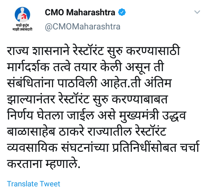 महाराष्ट्र राज्य सरकारने रेस्टॉरंट सुरु करण्यासाठी मार्गदर्शक तत्वे तयार केली असून ती सर्व संबंधितांना पाठवण्यात आली आहेत. तसेच ती अंतिम झाल्यानंतर रेस्टॉरंट सुरु करण्याबाबतचा निर्णय घेतला जाईल, असे मुख्यमंत्री उद्धव ठाकरे यांनी आज सांगितले.