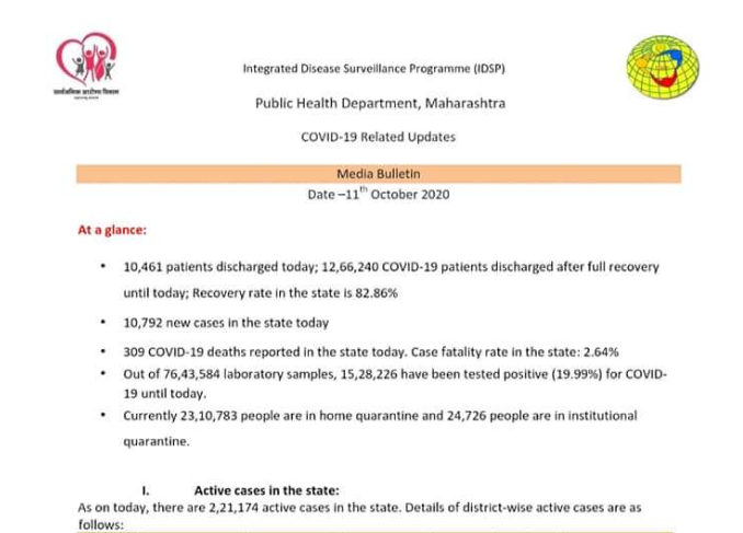 प्रयोगशाळेत आतापर्यंत तपासणीसाठी पाठविण्यात आलेल्या 76 लाख 43 हजार 584 नमुन्यांपैकी 15 लाख 28 हजार 226 रुग्णांचे रिपोर्ट पॉझिटिव्ह आले आहेत. सध्या राज्यात 23 लाख 10 हजार 783 लोक होम क्वारंटाईनमध्ये असून, 24 हजार 726 लोक संस्थात्मक क्वारंटाईनमध्ये आहेत.
