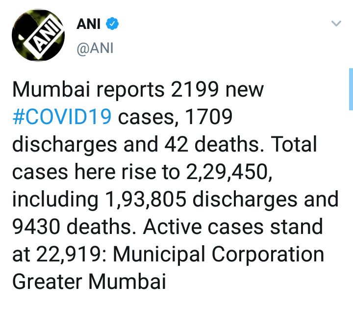 मुंबईत कालच्या दिवशी 2199 नव्या कोरोना रुग्णांची नोंद झाली. तर 42 जणांचा मृत्यू झाला. त्यामुळे मुंबईतील एकूण कोरोनाबाधितांची 2,29,450 वर पोहचली आहे. तर आतापर्यंत 1,93,805 जणांना डिस्चार्ज देण्यात आला आहे. तर 9,430 जणांनी आपला जीव गमावला आहे. सद्य स्थितीत 22,919 रुग्णांवर विविध रुग्णालयात उपचार सुरू आहेत.