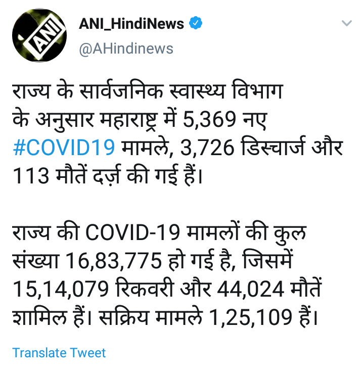 महाराष्ट्रात मागील 24 तासात 5,369 नवे कोरोनाबाधित रुग्ण आढळून आले. तर 113 रुग्णांचा मृत्यू झाला. त्यामुळे राज्यातील एकूण कोरोना बाधितांची संख्या 16 लाख 83 हजार 775 वर पोहचली आहे. तर मृतांचा एकूण आकडा 44 हजार 024 एवढा आहे.