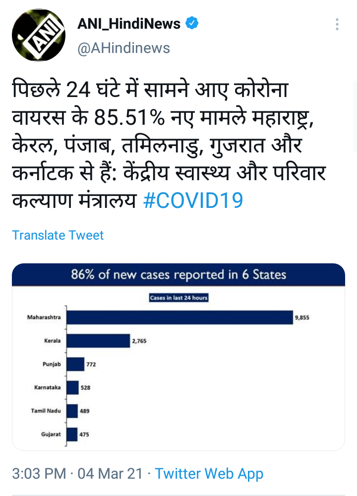 महाराष्ट्र, केरळ, पंजाब, तामिळनाडू, गुजरात आणि कर्नाटकमध्ये कोविडच्या दैनंदिन रुग्णांच्या आकड्यामध्ये वाढ नोंदविली जात आहे. गेल्या 24 तासांत नोंदवलेल्या नवीन रुग्णांपैकी 85.51% रुग्ण या राज्यातील आहेत.