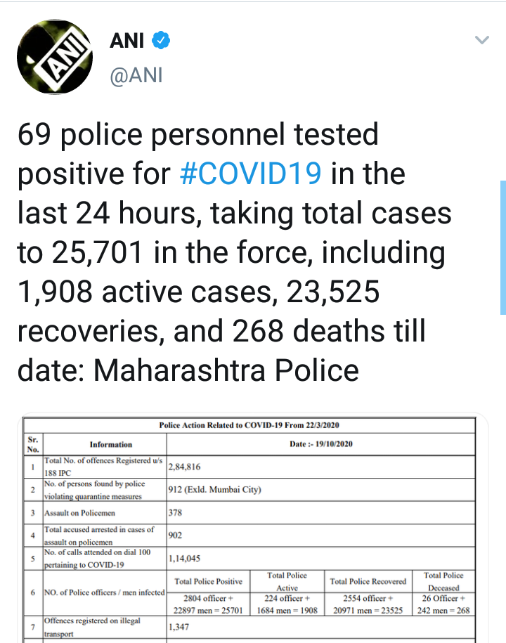 मिळालेल्या माहितीनुसार, आतापर्यंत आढळलेल्या 25,701 कोरोनाबाधित पोलिसांमध्ये 2804 पोलीस अधिकारी आणि 22,897 कर्मचाऱ्यांचा समावेश आहे. तर आतापर्यंत 23 हजार 525 पोलीस कर्मचाऱ्यांनी कोरोनावर यशस्वीरित्या मात केली असून त्यांना घरी सोडण्यात आले आहे. यामध्ये 2554 पोलीस अधिकारी आणि 20,971 पोलीस कर्मचाऱ्यांचा समावेश आहे.