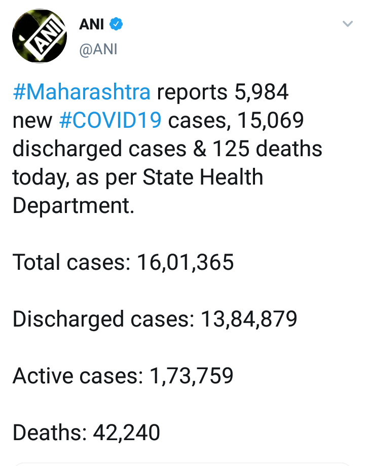 महाराष्ट्रात मागील 24 तासात 5,984 नवे कोरोनाबाधित रुग्ण आढळून आले. तर 125 रुग्णांचा मृत्यू झाला. त्यामुळे राज्यातील एकूण कोरोना बाधितांची संख्या 16 लाख 01 हजार 365 वर पोहचली आहे. तर मृतांचा एकूण आकडा 42 हजार 240 एवढा आहे. सोमवारी दिवसभरात 15,069 रुग्ण कोरोनामुक्त झाले.