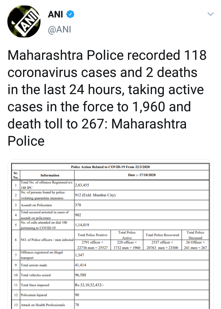 सद्यस्थितीत राज्यात 1960 कोरोनाबाधित पोलीस कर्मचाऱ्यांवर विविध रुग्णालयात उपचार सुरु आहेत. तर आतापर्यंत 267 पोलिसांनी आपला जीव गमावला आहे.