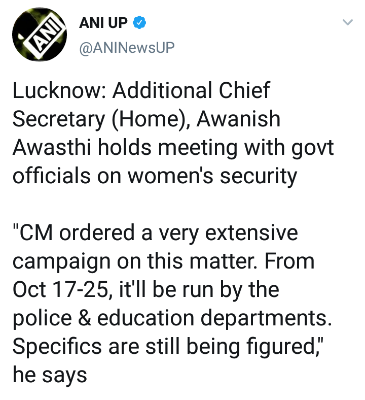 अवस्थी म्हणाले, मुख्यमंत्री योगी आदित्यनाथ यांनी महिलांच्या सुरक्षेसाठी एक अभियान चालवण्याचे आदेश दिले आहेत. हे अभियान पोलीस आणि शिक्षण विभागाच्या मदतीने चालवले जाणार आहे. या अभियानाची संपूर्ण कार्य योजना लवकरच समोर येईल असेही त्यांनी यावेळी सांगितले.