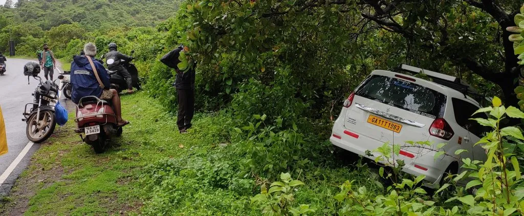 मंगळवारी संध्याकाळी 6 च्या सुमारास जीए 11 टी 1983 ही एर्टीगा टॅक्सी सलसा रेस्टॉरंट नंतरच्या वळणावरून थेट काजूच्या झाडावर धडक देऊन थांबली. चालक एच. हडफडकर यांचा वाहनावरील ताबा सुटल्याचा अंदाज व्यक्त होत आहे. वाहन रस्ता सोडून जात असल्याचे पाहून चालक भांबावला व पाण्यामुळे वाहनाचा ब्रेक वर्क झाला नसल्याचे समजते. या घटनेमुळे वाहनाचे किमान लाख रुपयांचे नुकसान झाल्याचा अंदाज आहे.