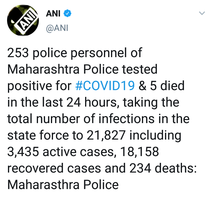 सद्यस्थितीत राज्यात 3435 कोरोनाबाधित पोलीस कर्मचाऱ्यांवर विविध रुग्णालयात उपचार सुरु आहेत. यामध्ये 440 पोलीस अधिकारी आणि 2995 पोलीस कर्मचाऱ्यांचा समावेश आहे. तर आतापर्यंत कोरोनामुळे 234 जणांचा मृत्यू झाला आहे. यामध्ये 23 पोलीस ऑफिसर आणि 211 पोलीस कर्मचाऱ्यांचा समावेश आहे.