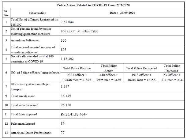 मिळालेल्या माहितीनुसार, आतापर्यंत आढळलेल्या 21,827 कोरोनाबाधित पोलिसांमध्ये 2381 पोलीस अधिकारी आणि 19,446 कर्मचाऱ्यांचा समावेश आहे. तर आतापर्यंत 18 हजार 158 पोलीस कर्मचाऱ्यांनी कोरोनावर यशस्वीरित्या मात केली असून त्यांना घरी सोडण्यात आले आहे. यामध्ये 1918 पोलीस अधिकारी आणि 16,240 पोलीस कर्मचाऱ्यांचा समावेश आहे.