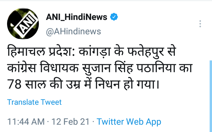 फतेहपुर विधानसभा क्षेत्रातील काँग्रेसचे आमदार सुजान सिंह पठानिया यांचे शुक्रवारी निधन झाले. ते 78 वर्षांचे होते. मागील काही दिवसांपासून ते आजारी होते.