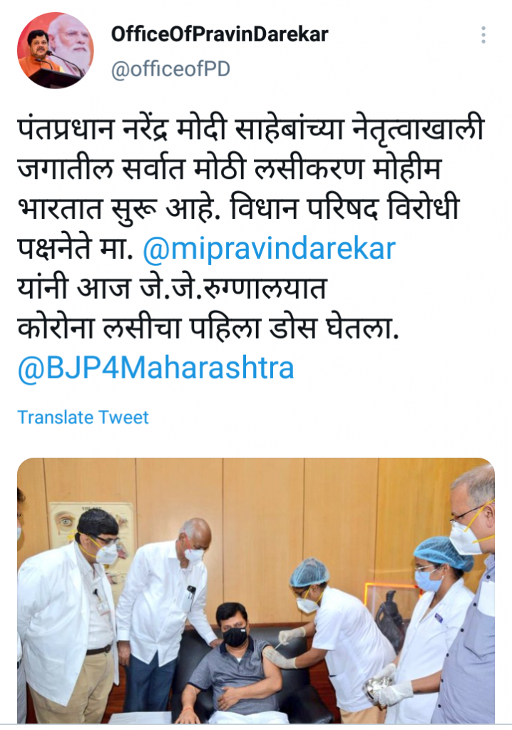 दरम्यान, विरोधी पक्षनेते प्रविण दरेकर यांनी देखील आज जे. जे. रुग्णालयात जाऊन कोरोनाची पहिली लस घेतली. ते म्हणाले, लसीकरणाची प्रक्रिया फार सोपी असून जे नागरिक पात्र आहेत, त्यांनी न घाबरता लस घ्यावी असे आवाहन केले आहे.