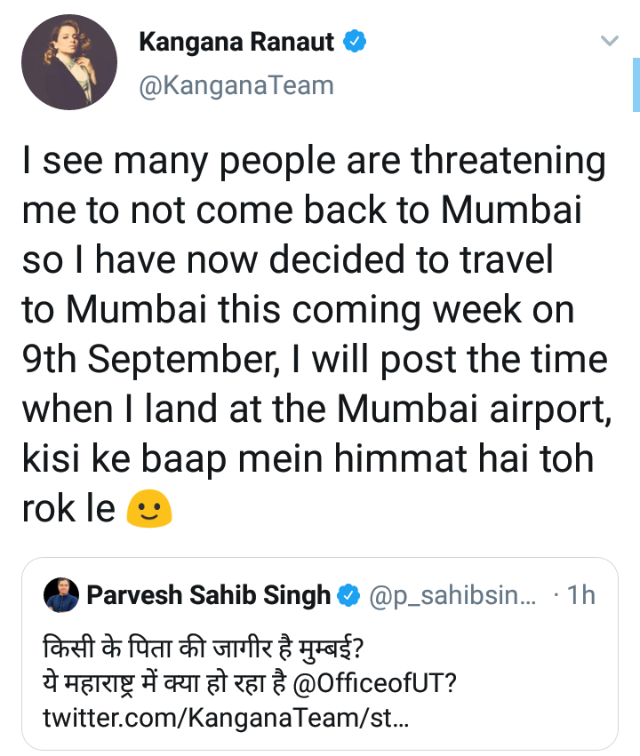 ती आपल्या ट्विटमध्ये म्हणते की, मी मुंबईत येऊ नये अशी मला बरेच लोक धमकी देत आहेत. म्हणूनच मी येत्या आठवड्यात मुंबईत येण्याचा निर्णय घेतला आहे. मुंबई विमानतळावर उतरण्याआधी मी मुंबईत येण्याची तारीखही कळवेन. कुणाच्या बापाची हिम्मत असेल तर रोखून दाखवा. असे ट्विट करत कंगनाने धमकी देणाऱ्यांना प्रत्युत्तर दिले आहे.