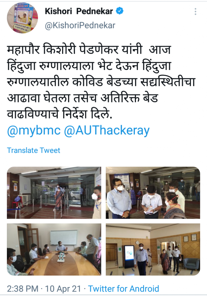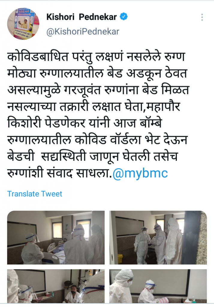 विकेंड लॉकडाऊनच्या पार्श्वभूमीवर महापौर पेडणेकर यांनी बॉम्बे रुग्णालयातील कोविड वॉर्डला भेट देऊन बेडची सद्यस्थिती जाणून घेत रुग्णांशी संवाद साधला. त्यावेळी त्यांनी विरोधकांवरही निशाणा साधला आहे.