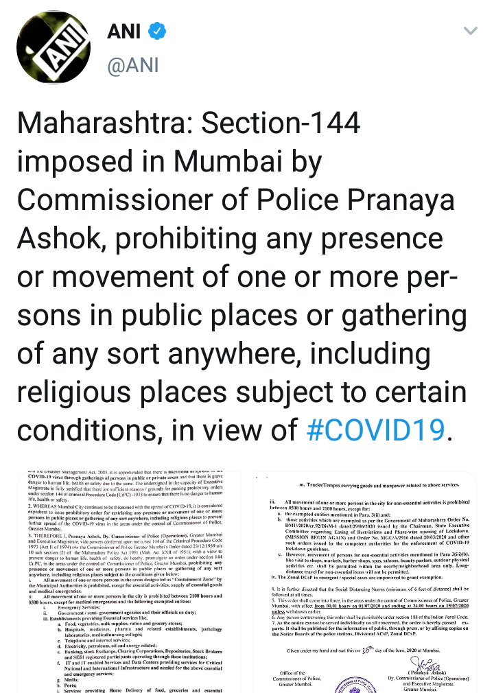 या अंतर्गत आज मध्यरात्री पासून मुंबईत कलम 144 लागू करण्यात आले आहे. आज मध्यरात्री पासून 15 जुलैच्या रात्री 12 वाजेपर्यंत ही संचारबंदी लागू करण्यात आली आहे.