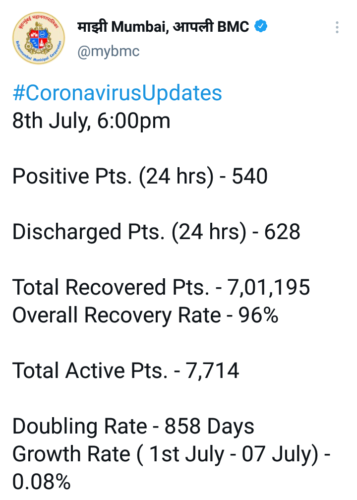 दरम्यान, गेल्या 24 तासांत मुंबईत कोरोनाने 13 रुग्णांचा मृत्यू झाला आहे. काल ही संख्या 9 इतकी होती. या सोबतच, मुंबईत आतापर्यंत एकूण 7 लाख 1 हजार 198 रुग्ण बरे झाले असून आतापर्यंत एकूण 15,586 रुग्णांनी आपला जीव गमावला आहे. सध्या मुंबईत रुग्ण बरे होण्याचे प्रमाण आता 96 टक्के इतके असून कोविड रुग्णवाढीचा दर 0.08 टक्के इतका खाली आला आहे. तर रुग्ण दुप्पटीचा कालावधी आता 858 दिवसांवर जाऊन पोहचला आहे.