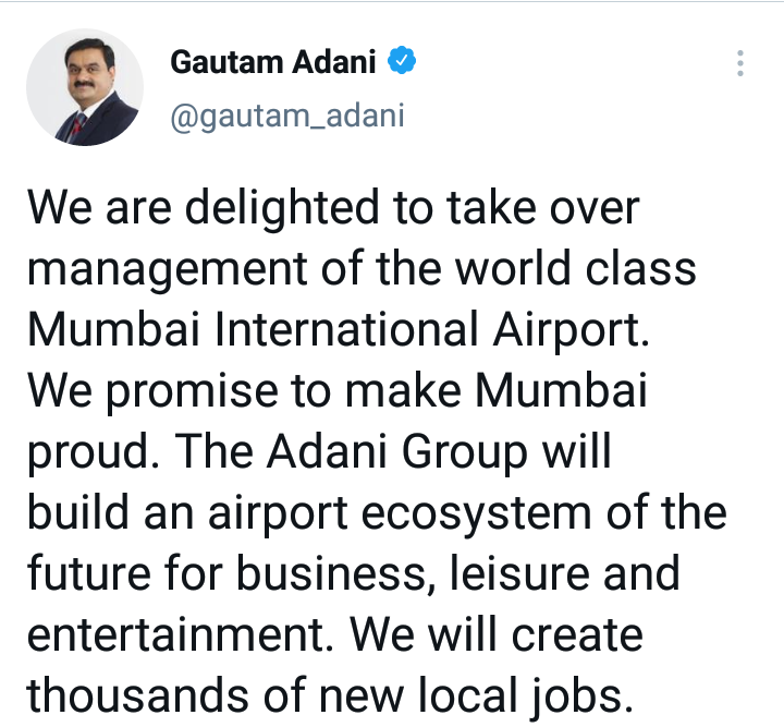 जागतिक दर्जाच्या मुंबई आंतरराष्ट्रीय विमानतळाच्या देखभाल आणि हाताळणीची जबाबदारी देण्यात आल्याबद्दल आम्हाला आनंद आहे. आम्ही मुंबईला अभिमान वाटेल असे काम करण्याचे मी वचन देतो. अदानी समूह व्यवसाय, विश्रांती आणि मनोरंजनासाठी भविष्यात विमानतळ परिसंस्था तयार करेल. आम्ही हजारो नवे जॉब्स निर्माण करू, असे गौतम अदानी त्यांच्या ट्विटमध्ये म्हणाले.