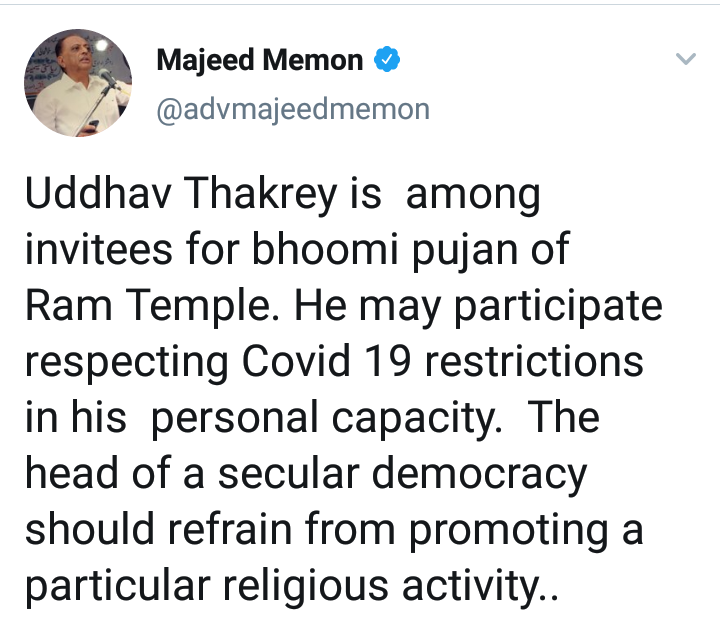 या संदर्भात माजीद मेमन यांनी ट्वीट केलं आहे की, उद्धव ठाकरे हे राम मंदिराच्या भूमिपूजन सोहळ्याच्या कार्यक्रमातील निमंत्रित पाहुण्यांपैकी एक आहेत. कोविडच्या पार्श्वभूमीवर आवश्यक ती खबरदारी घेऊन उद्धव ठाकरे सहभागी होऊ शकतात. मात्र धर्मनिरपेक्ष सरकारच्या प्रमुखाने असे धार्मिक सोहळे टाळायला हवे.