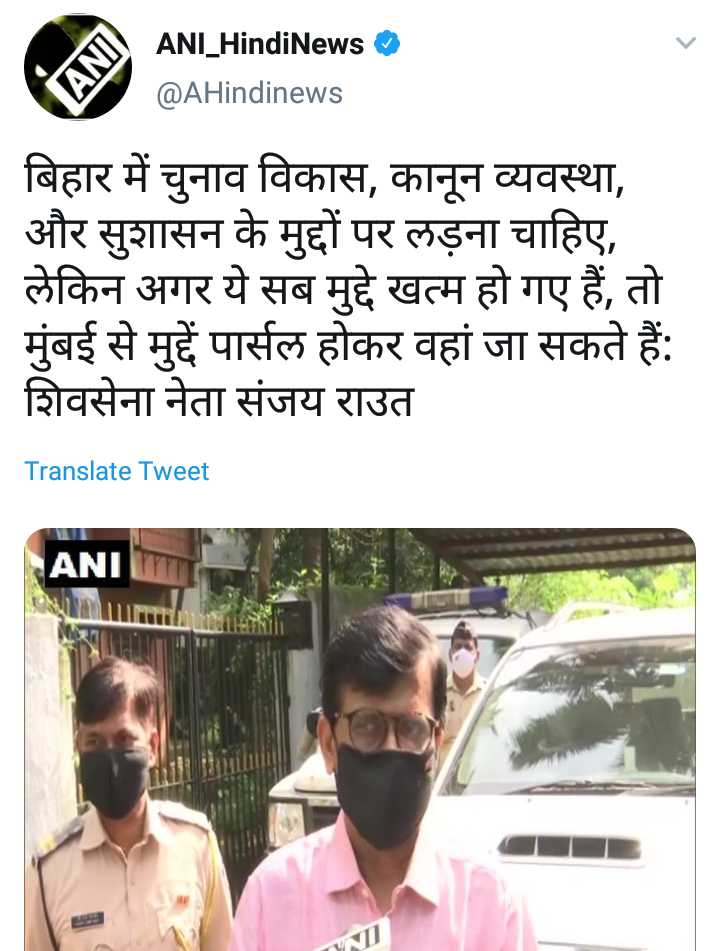 संजय राऊत यांनी म्हटले की, बिहारची निवडणूक ही विकास आणि कायदा सुव्यवस्थेच्या मुद्द्यांवर लढली जावी. जर बिहार निवडणुकीत मुद्दे कमी असतील तर मुंबईहून पार्सल केले जाऊ शकतात.