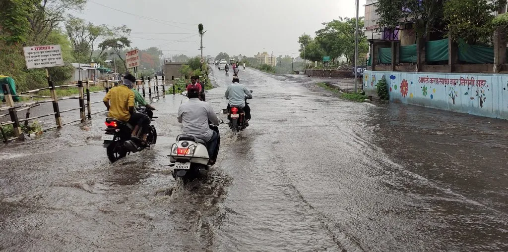 पावसाळ्याच्या काळात विद्यानगर येथील रस्त्यावर मोठय़ा प्रमाणात पाणी साचते. वारंवार मागणी करूनही हे काम मार्गी लागले नाही. त्यामुळे यावर्षीही लोकांना गुडघाभर पाण्यातून वाट काढावी लागणार आहे. याची प्रचिती सोमवारी आली. केवळ दोन तास पडलेल्या पावसाने या रस्त्यावर मोठय़ा प्रमाणात पाणी साचले होते. त्यामुळे राष्ट्रीय महामार्ग विभागाने या ठिकाणी पाण्याचा निचरा करण्यासाठी तातडीने उपाययोजना राबवण्याची मागणी होत आहे.