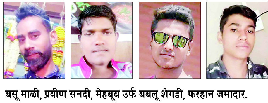 प्रवीण सनदी याला मोटारसायकलवरून घरी सोडण्यासाठी बसू माळी जात होता. यावेळी मोटारसायकलवर मेहबूब शेगडी व फरहान जमादारही होते. बसू माळी हा मोटारसायकल चालवत होता. चौघेजण एकाच मोटारसायकलवरून भरधाव निघाले होते. दरम्यान मोटारसायकलला हेडलाईट व ब्रेक नसल्याने येथील पर्वतराव पेट्रोलपंपनजीकच्या सेवा रस्त्यावर आल्यावर संरक्षक कठडा दिसला नाही.
