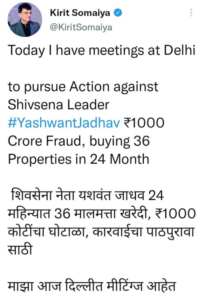 सोमय्या यांनी यासंदर्भात केलेल्या ट्विटमध्ये म्हटले आहे की, ”यशवंत जाधव यांची 24 महिन्यात 36 मालमत्तांची खरेदी, 1000 कोटींच्या या घोटाळ्याच्या कारवाईचा पाठपुरावा करण्यासाठी दिल्लीत दाखल झालो आहे. यासंदर्भात आज माझ्या काही मिटिंग्ज आहेत.