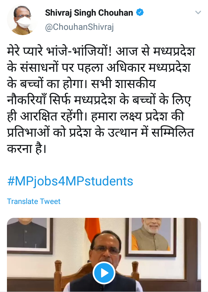 शिवराज सिंह चौहान यांनी ट्विटर वर एक व्हिडियो शेअर केला आहे. त्यात ते म्हणाले की, आज मध्य प्रदेश सरकारने एक महत्वाचा निर्णय घेतला आहे. प्रदेशातील सर्व सरकारी नोकऱ्या केवळ राज्यातील स्थानिकांनाच दिल्या जातील. यासाठी आवश्यक असलेली कायदेशीर तरतूद केली जात आहे. राज्यातील संसाधनांवर राज्यातील मुलांचाच अधिकार आहे, असे म्हटले आहे.