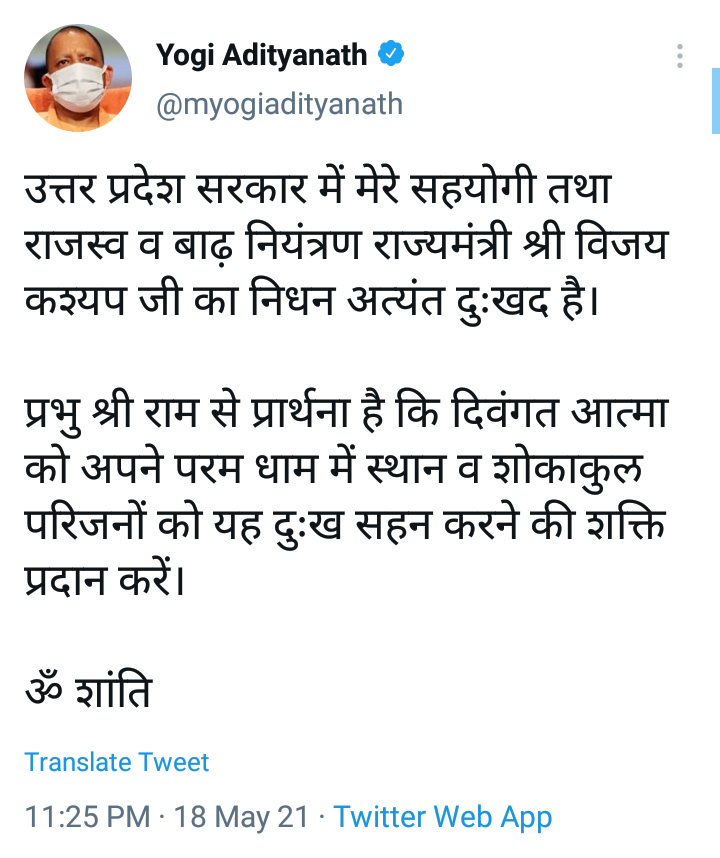 उत्तर प्रदेश सरकारमधील पूर नियंत्रण आणि महसूल राज्य मंत्री तसेच मुजफ्फरनगरचे चरथावल विधानसभा मतदारसंघाचे भाजप आमदार विजय कश्यप यांचे मंगळवारी कोरोनामुळे निधन झाले. मागील 20 दिवसांपासून त्यांच्यावर गुरुग्राममधील मेदांता रुग्णालयामध्ये उपचार सुरु होते. मंगळवारी रात्री साधारण 10 वाजण्याच्या सुमारास अंतिम श्वास घेतला. ते 52 वर्षांचे होते.
