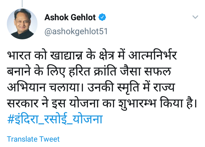 या योजनेची सुरुवात माजी पंतप्रधान स्वर्गीय राजीव गांधी यांच्या जयंती दिवशी म्हणजेच गुरुवारी मुख्यमंत्री अशोक गेहलोत यांच्या हस्ते ऑनलाईन प्रणालीद्वारे करण्यात आली. यावेळी गेहलोत म्हणाले, इंदिरा रसोई योजना प्रदेशातील विशेष योजना आहे. या योजनेत शहरातील गरीब कुटुंबांना पौष्टिक भोजन स्वस्त दरात दिले जाणार आहे.
