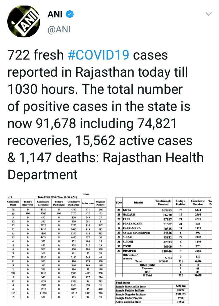 या राज्यात आता पर्यंत केवळ 1, 147 जणांनी आपला जीव गमावला आहे. यामध्ये जयपूरमधील सर्वाधिक 289 जण, जोधपुरमधील 110 आणि कोटातील 80 तर अजमेर मधील 78 जणांचा मृत्यू झाला आहे. अधिकाऱ्यांच्या म्हणण्यानुसार, अनेक रुग्णांना कोरोना व्यतिरिक्त इतर आजारांची लागण झाली होती.