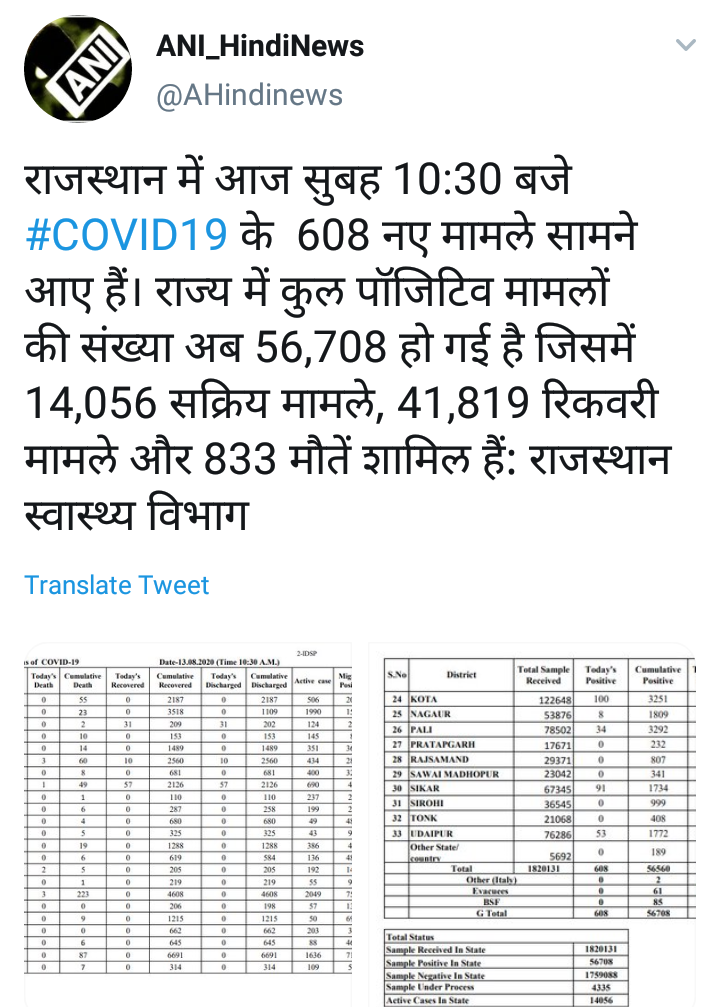 आज आढळलेल्या रुग्णांमध्ये अलवार मधील 73 बारमेर 32, बिकानेर 78 चितोरगर 33, दऊसा 7, गंगानगर 6, हनुमानगर 20, जयपूर 59, जलोरे 14, कोटा 100, नागौर 8, पाली 34, सिकार 91 आणि उदयपूर मधील 53 जणांचा समावेश आहे.