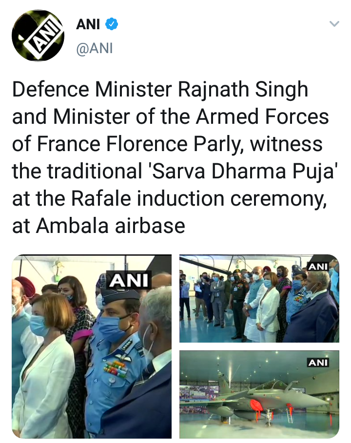 वायू दलात समावेश करण्यापूर्वी राफेल विमानांचे सर्वधर्मीयांकडून पूजन करण्यात आले. संरक्षण मंत्री राजनाथ सिंह, लष्करप्रमुख जनरल बिपिन रावत आणि वायुसेनेचे एअर चीफ मार्शल आरकेएस भदौरिया यांच्या उपस्थितीत राफेल विमाने भारतीय वायू दलात दाखल झाली.