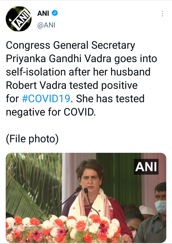 मागील वर्षी सप्टेंबर महिन्यात देखील प्रियांका गांधी स्वतः च्या घरी क्वारंटाइन झाल्या होत्या. त्यांच्या घरातील आचाऱ्याला कोरोनाची लागण झाली होती. त्यानंतर त्या 14 दिवस क्वारंटाइनमध्ये होत्या.