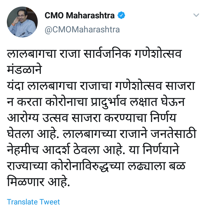ते आपल्या ट्विट मध्ये म्हणाले की, लालबागचा राजा सार्वजनिक गणेशोत्सव मंडळाने यंदा लालबागचा राजाचा गणेशोत्सव साजरा न करता कोरोनाचा प्रादुर्भाव लक्षात घेऊन आरोग्य उत्सव साजरा करण्याचा निर्णय घेतला आहे. लालबागच्या राजाने जनतेसाठी नेहमीच आदर्श ठेवला आहे. या निर्णयाने राज्याच्या कोरोनाविरुद्धच्या लढ्याला बळ मिळणार आहे. असे उद्धव ठाकरे यांनी म्हटले आहे.