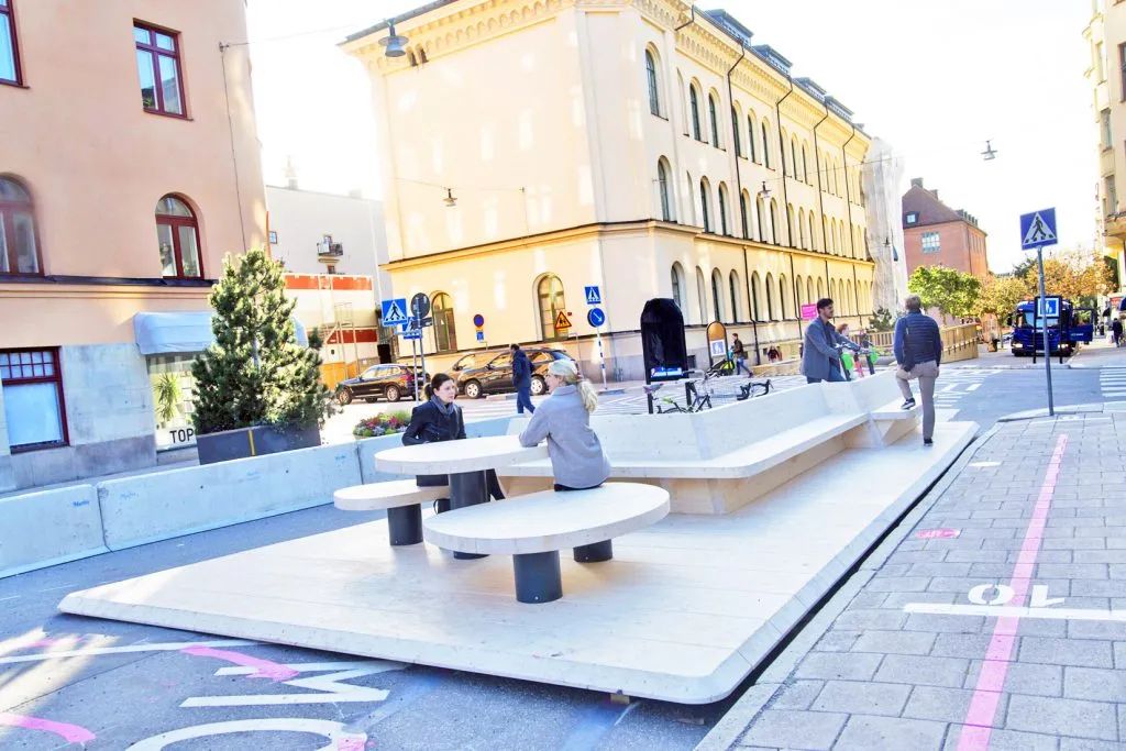 स्वीडनच्या गोथेनबर्ग शहरात एका सॉसेस शॉपसमोर काही दिवसांपूर्वी एक वाहनतळ होता, पण तेथे आता एक बेंच, पिकनिक टेबल, सायकल आणि स्कुटरचे रॅक तयार करण्यात आले आहेत. तेथे लोक सहजपणे गप्पागोष्टी, करू शकतात, खाद्यपदार्थांवर ताव मारण्यासह मनोरंजन करू शकतात.