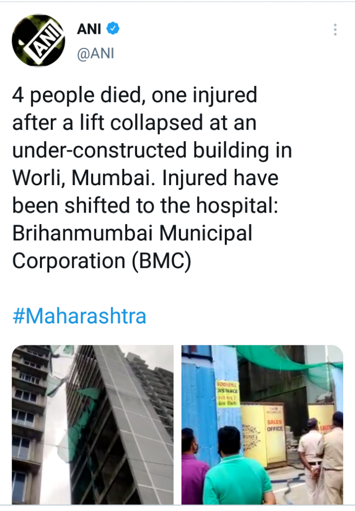 या घटनेची माहिती मिळताच अग्निशमन दलाचे जवान घटनास्थळी दाखल झाले असून मदतकार्य सुरू आहे. अग्निशमन दलाच्या जवानांनी दिलेल्या माहितीनुसार, या इमारतीत पार्किंगचे बांधकाम सुरू होते. याच दरम्यान लिफ्ट कोसळली. यात दुर्घटनेत सापडून 4 जणांचा मृत्यू झाला असून बचावकार्य सुरू आहे.