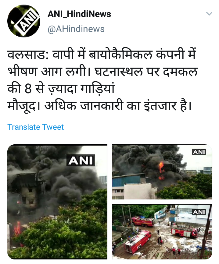 गुजरातमध्ये वलसाडमधील वापी मध्ये असणाऱ्या बायोकेमिकल कंपनीला शनिवारी भीषण आग लागली. या घटनेची माहिती मिळताच घटनास्थळी अग्निशमन दलाच्या तब्बल 8 गाड्या पोहोचल्या आहेत. त्यांच्याकडून आगीवर नियंत्रण मिळवण्याचे काम सुरु आहे.