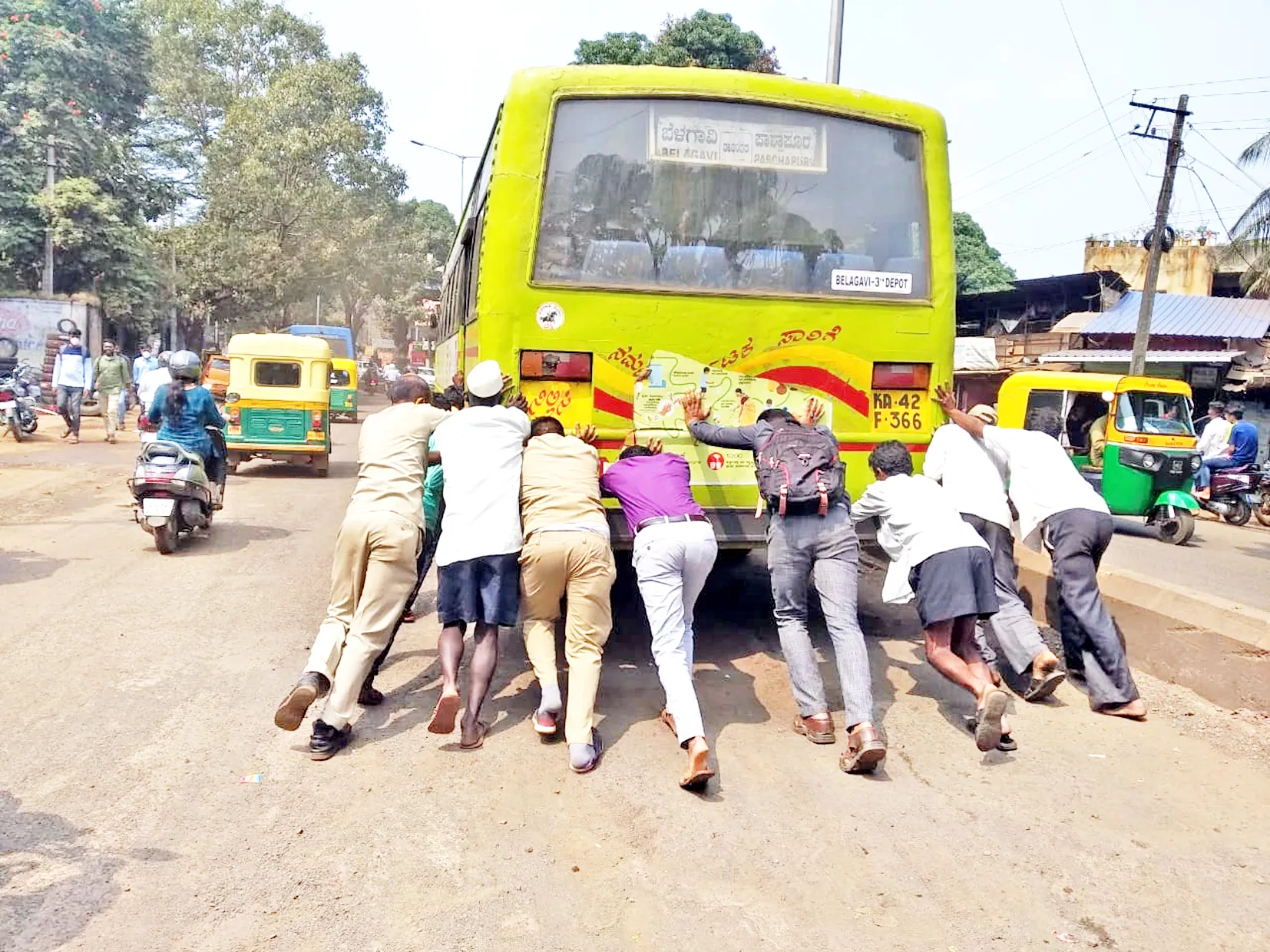 शहरातील अशोक चौकापासून आरटीओ सर्कलच्या दिशेने मार्गस्थ झालेली परिवहनची एक बस अचानक रस्त्यातच बंद पडली. त्यामुळे वाहतुकीला मोठा अडथळा निर्माण झाला. शहराच्या विविध ठिकाणी होणारी वाहतूक कोंडी डोकेदुखीची ठरत आहे. याबरोबरच आरटीओ सर्कल येथील वाहतूक कोंडी नित्याची बाब ठरत आहे. अशातच बुधवारी रस्त्यावरच नादुरुस्त होऊन बस बंद पडल्याने वाहतूक कोंडीत भर पडली. अखेर वाहतूक कोंडीत अडकलेल्या बसला प्रवाशांनी धक्का मारून बाहेर काढले.