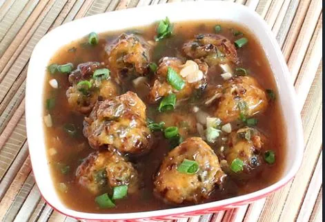 कृती : गरम तेलात सर्व भाज्या व बॉल्ससाठी दिलेले साहित्य टाकून तीन ते चार मिनिटे परतवावे. मिश्रण गार झाले की एकसमान सहा भागात विभागून त्याचे बॉल्स बनवून गरम तेलात सोनेरी रंगावर तळून घ्यावेत. आता सॉसाठी गरम तेलात लसूण, आलं आणि हिरवी मिरची परतवून घ्यावी. नंतर त्यात कांदापातीचा पांढरा कांदा टाकून परतवावा. नंतर कांदापात, सर्व सॉस व इतर साहित्य आणि चमचाभर पाणी टाकून दोन मिनिटे मिश्रण शिजवावे. आता तयार बॉल्स खाण्यास देताना गार्लिक सॉसमध्ये मिक्स करून खाण्यास द्या.