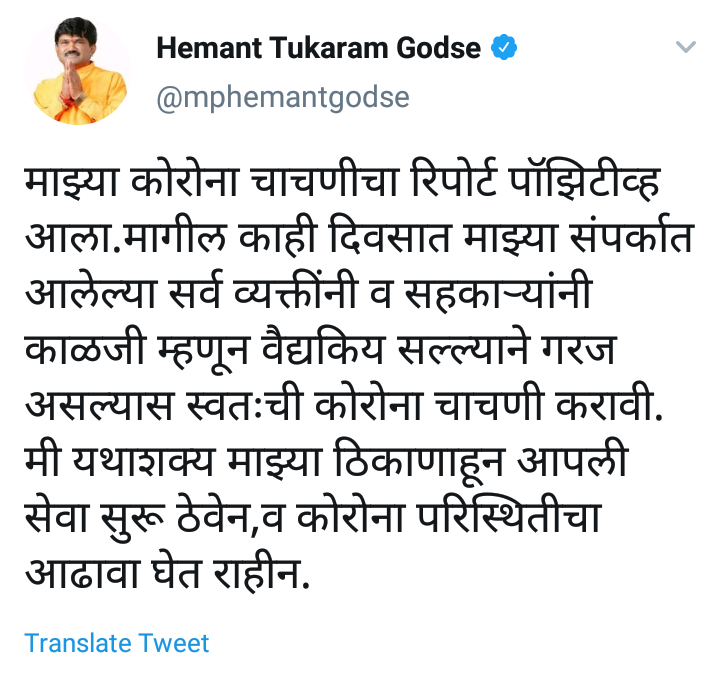 शिवसेना खासदार हेमंत गोडसे यांना कोरोनाची बाधा झाली आहे. स्वतः गोडसे यांनी ट्विट करत याबाबत माहिती दिली.