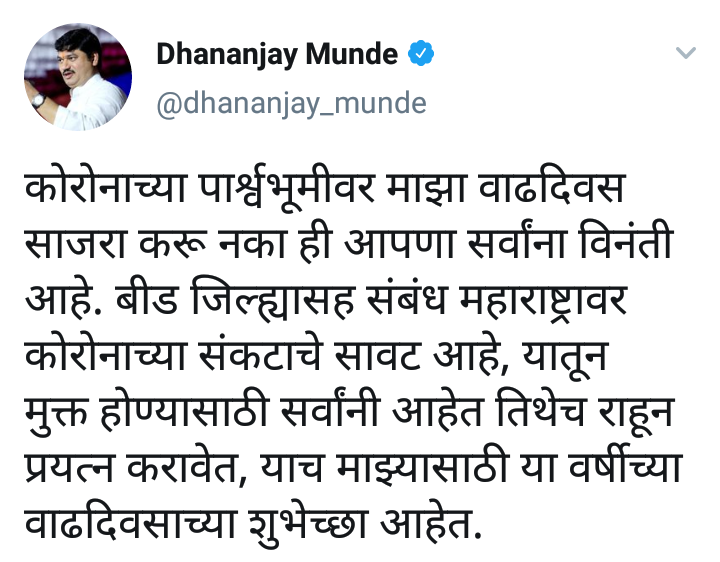 ते आपल्या ट्विट मध्ये म्हणतात की, कोरोनाच्या पार्श्वभूमीवर माझा वाढदिवस साजरा करु नका ही आपणा सर्वांना विनंती करतो. सध्या बीड जिल्ह्यासह संबंध महाराष्ट्रावर कोरोनाच्या संकटाचे सावट आहे, यातून मुक्त होण्यासाठी सर्वांनी आहेत तिथेच राहून प्रयत्न करावेत, याच माझ्यासाठी या वर्षीच्या वाढदिवसाच्या शुभेच्छा आहेत.