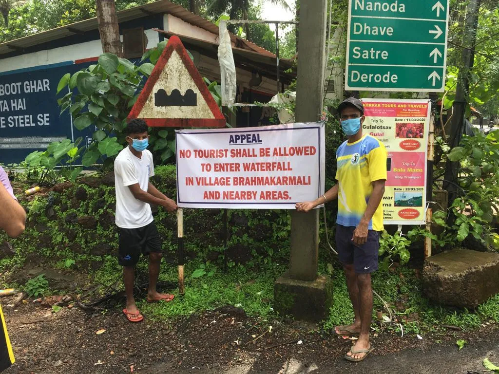 सध्या पावसाळा सुरु झाल्यामुळे सत्तरी तालुक्मयातील धबधब्याच्या ठिकाणी पर्यटक येण्यास सुरुवात झाली आहे. सत्तरी तालुका उपजिल्हाधिकारी मंगलदास गावकर यानी धबधब्यावर पर्यटकांना पूर्णपणे बंदी घालण्याचा आदेश नुकताच दिलेला आहे. असे असतानाही रविवारी धबधब्याच्या ठिकाणी आलेल्या पर्यटकांना स्थानिक नागरिकांनी हाकलून लावण्याचा प्रकार घडला. यामुळे या गावातील ग्रामस्थानी नो व्हिजिटर्स ड्रॉईंग कोरोना या मिशनला सध्यातरी सुरुवात केल्याचे समजते.